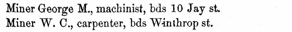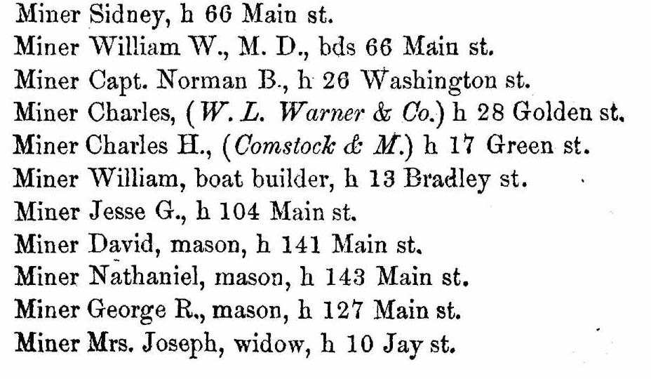 In the 1855 city directory, Nathaniel Miner lived at 143 Main St New London, Connecticut. George had moved next door to 127 Main Street. Interestingly, all the Miners in New London spelled their name with an “er”, not an “or”.