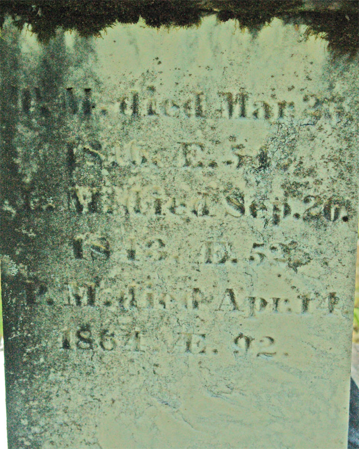 Timothy Miner Detail – The stone is very difficult to read. Most genealogies say Timothy died 26 Mar 1816, but this looks more like 26 Sep 1813 to me. Also age 52 matches in 1813 Timothy’s 1762 birth.