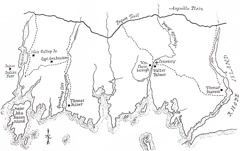 Walter along with several others were also dissatisfied over the townspeople voting to consolidate with Plymouth Colony. He was in favor of an alliance with The Massachusetts Bay Colony. Prior to 1653 John Winthrop Jr. who had been granted land in that part of Connecticut known as The Pequot Country by The Massachusetts Bay Colony urged William Chesebrough, also one of those dissatisfied with The Plymouth Colony to settle in New London. Upon examination, William Chesebrough preferred that part of the country known by the Indians as Wequetequoc. He applied for a grant of 300 acres which was soon increased to 2300 acres. He then induced Walter Palmer and Walter’s son in law Thomas MINER to join him there. Walter bought land on the East Bank of Wequetequoc Cove. It would appear that the land was originally placed in the name of Thomas Minor and later vested in the name of Walter Palmer.
