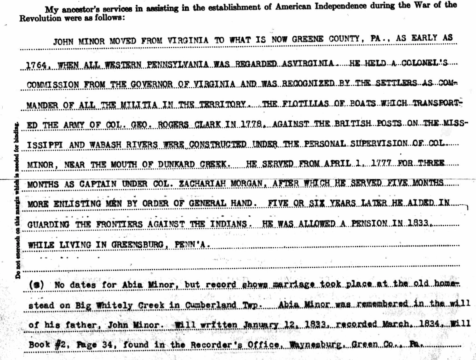 Colonel Minor, under orders, built the flotilla of boats designed for the transportation of the regiment of enlisted soldiers under the command of General George Rogers Clark, who descended the Ohio River with a view of reaching British posts on the Wabash and on the Mississippi. The boats were constructed at the mouth of Dunkard Creek, in Greene County, under the immediate supervision of Colonel Minor. Their completion was greatly retarded by the raids of Indians, which Colonel Minor had to repel by organized companies of flying militia, under his command.