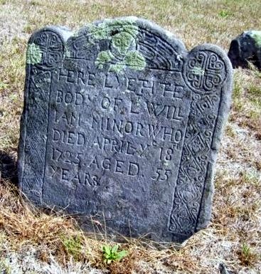 | HERE LYETH THE BODY OF LT WILL IAM MINOR WHO DIED APRIL YE 18TH 1725 AGED 55 YEARS |