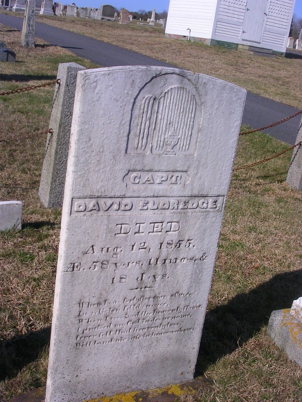 vi. Capt. David Eldredge b. 24 Aug 1796 in Chatham, Barnstable, Mass; d. 12 Aug 1855 Chatham, Mass.; Burial: Seaside Cemetery ; m. Aft. 05 May 1822 in int, Brewster, Barnstable, Mass. to Sarah “Sally” Crosby (b: 13 Mar 1799 in Harwich, Barnstable, Mass. – 13 May 1871 Chatham; Burial: Seaside Cemetery). Sally’s parents were Samuel Crosby Jr.( b: 1767 ) and Mercy Wing (b: 24 Jan 1772 in Harwich (now Brewster), Barnstable, Mass.) David and Sally had five children born between 1823 and 1835.