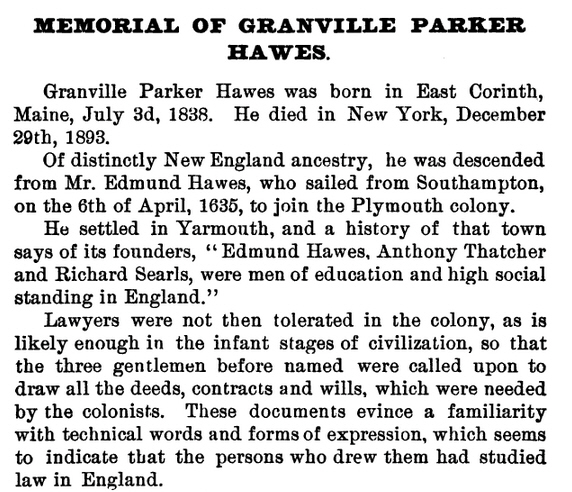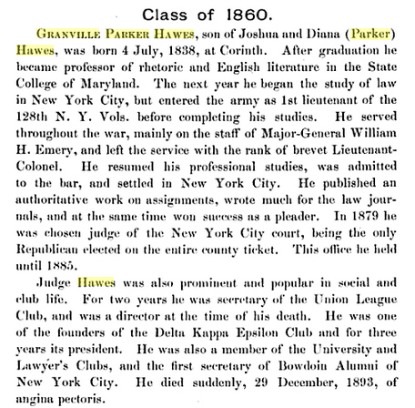 Isaac’s most famous grandson was Granville Parker Hawes b: 03 Jul 1838 East Corinth, Maine. He served on the general staff in the Civil War and was elected judge in New York City. I’ve included his memorial from the Association of the Bar of the City of New York Year Book 1895