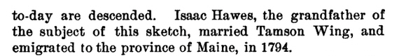 TAMSIN, a daughter of David and Temperance Kelly Wing  married Isaac Hawes in 1792, and removed to Vassalborough, Kennebec county, Maine, where Isaac built a house on his father’s land, which is still standing and in the possession of the family. They had eleven children, all of whom lived to maturity, the first one who died being forty-five years old. Mr. Hawes died in 1840, aged seventy-five, and his wife in 1844, aged seventy-two. Besides their children, they lived to see around them fifty-seven grandchildren and about eighty great-grandchildren.