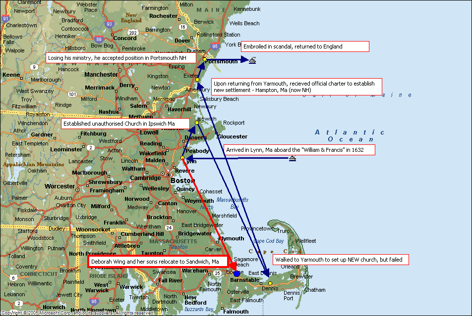 Thus preaching, persecuted, and adhered to by his former parishioners, Bachiler passed twenty years and reached the age of seventy. His children had grown up and married; one son had become a chaplain in an English regiment in Holland, and one a merchant in Southampton. Deborah married Rev. John WING, an English Puritan minister at Flushing and The Hague; and Theodate married Christopher Hussey, perhaps a relative of the mayor of Winchester of the same name, who married a daughter of the Hampshire Puritan Renniger; Ann married a Hampshire Samborne, probably connected with James Samborne, the Winchester scholar and Oxford graduate, Puritan vicar of Andover and rector of Upper Clatford, neighboring villages to Wherwell.
