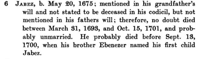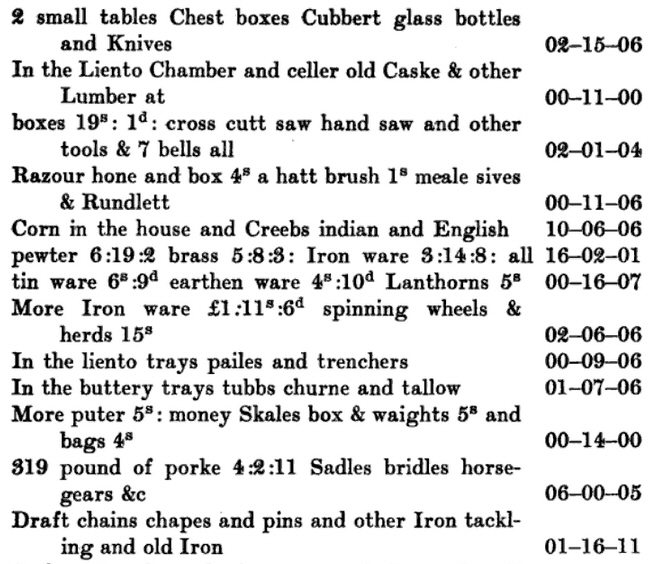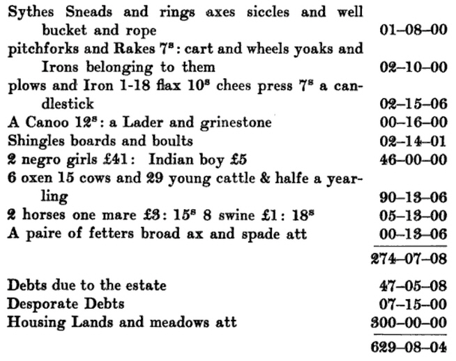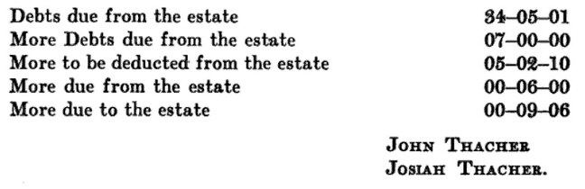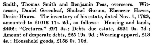Witnesses were John, Peter and Josiah Thacher. The inventory, taken 25 Nov 25, 1701 amounted to L629-8-4.  A typical estate of the time of an independent farmer was about 150 pounds, so John was a comparatively rich man.  Major John GORHAM and John Thacher, Esq., were named overseers of the will.