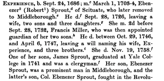 Experience’s first husband Lt. Ebenezer Sprout was born May 1676 in Scituate, Plymouth, Mass. His parents were Robert Sprout and Elizabeth Sampson. Ebenezer died 28 Sep 1726 in Middleboro, Plymouth, Mass