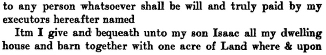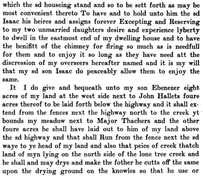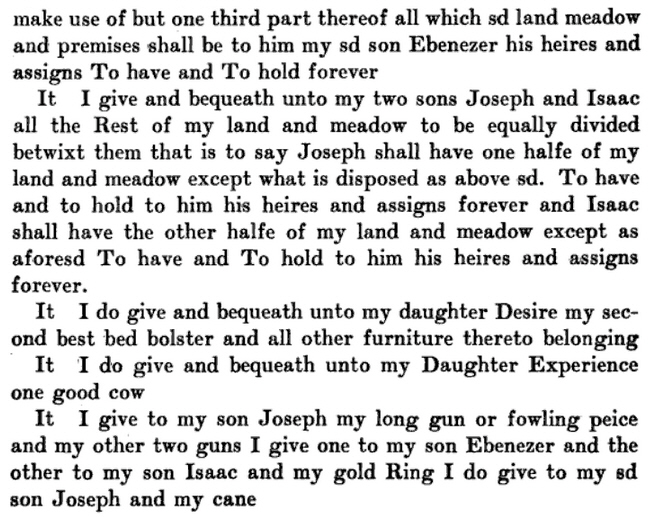 His son Isaac received his dwelling house and barn along with one acre of land and he was directed to allow his unmarried daughters Desire and Experience freedom to dwell in the eastern most end of the house and have use of the chimney.  His son Ebenezer received 8 acres of land, 4 acres adjacent to John Hallet and Major Thacher.  The other four were to be in the land above the highway.  He also received part of his creek thatch land.  All the rest of his land and meadow was to be equally divided between his sons Joseph and Isaac.  He distributed his guns to sons Ebenezer and Isaac.  His gold ring and cane went to Joseph.  Mary Bacon received a small gold ring. The rest of his movable estate went to sons John and Benjamin and his four daughters.