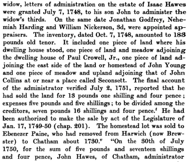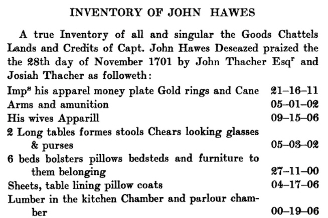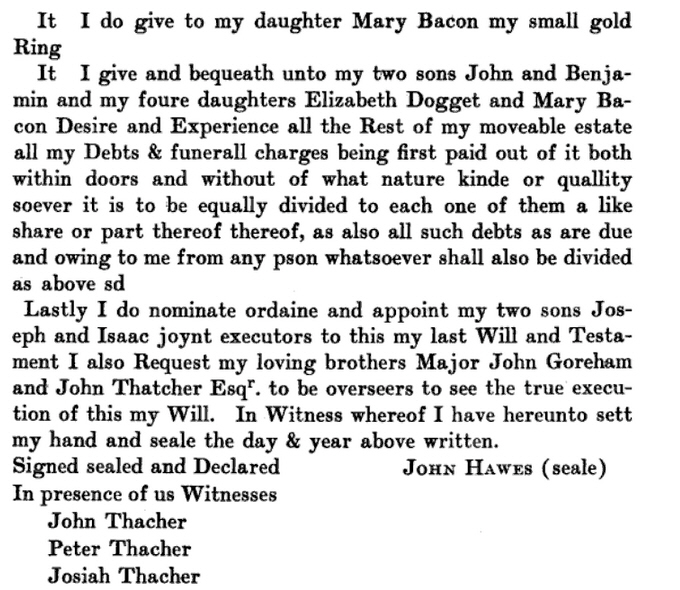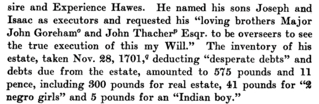 The will of John Hawes dated 15 Oct and proved 19 Nov 1701 reflected his large family.  He mentions his sons John, Joseph, Ebenezer, Isaac and Benjamin and his daughters Elizabeth Dogget, Mary Bacon, Desire and Experience Hawes.  His sons Joseph and Issaac were executors.  His ‘brothers” Major John Goreham and John Thacher Esqr. were overseers.  The inventory of his estate, after deducting debts, was 574 pounds and 11 pence, including 300 pounds for real estate, 41 pounds for “2 negro girls,” and 5 pounds for an “Indian boy.”  Sons Joseph and Isaac were appointed executors.