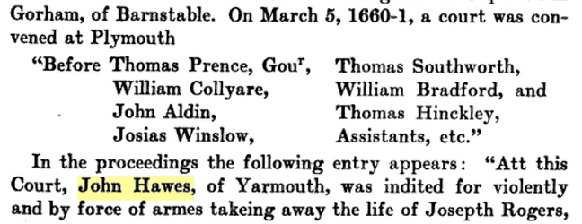 “John Hawes was found not guilty of “takeing away the life of Joseph Rogers of Eastham by giveing him a most deadly fall, on the 25 of December 1660 . . . whereof he . . . about 48 hours after died”..