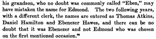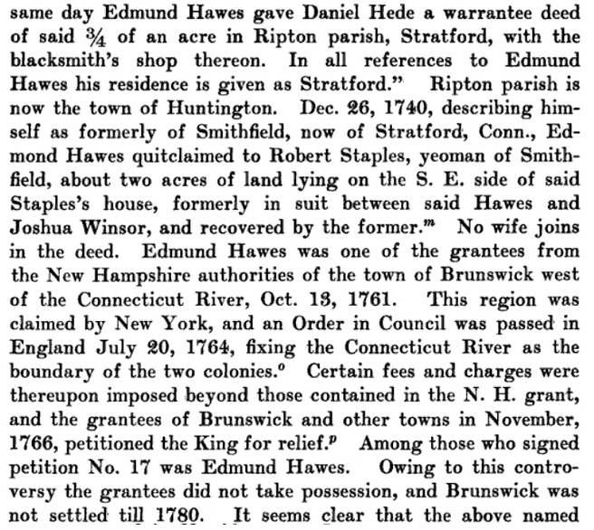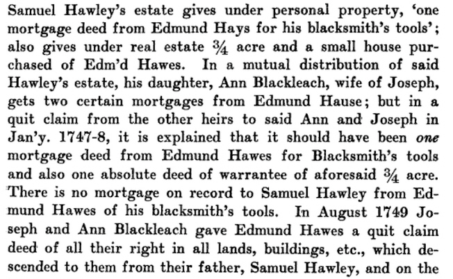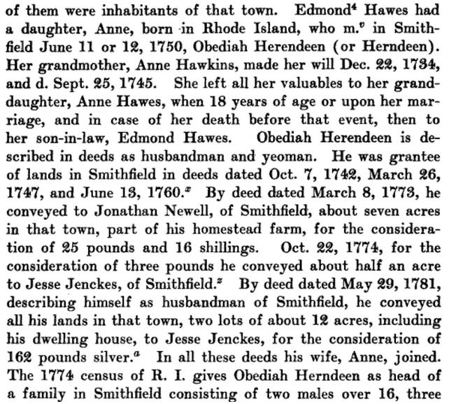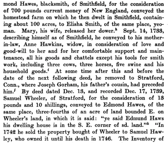 i. Edmund Hawes b. 1702 in Yarmouth, Plymouth, Mass; m1. 8 May 1722 in Providence, Rhode Island to Mary Hawkins (b. 11 Dec 1690 in Providence, Providence, Rhode Island – d.  btw. 6 Mar 1733 and 14 Sep 1733)  Mary’s parents were Edward Hawkins and Anne [__?__].  Edmund and Mary had three children born between 1723 and 1727.