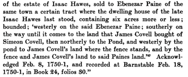 When his father died in 1693, John Hawes, an only child, inherited all of his land and possessions.  At this time and perhaps earlier he occupied his father’s house.  In 1693 he was on a committee to choose a schoolmaster and in 1693 and 1696 he was appointed to settle and survey the boundary line between Yarmouth and Barnstable.   His tax in 1698 was 4 pounds, 9 shillings and 5 pence.  In 1694 the boundaries of about 16 acres or more, most of which he had owned for about 30 years, were fixed by John Thacher, Jeremiah HOWES  and John Miller.  This tract was granted to him by the town shortly after his marriage.