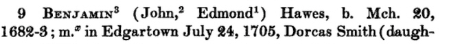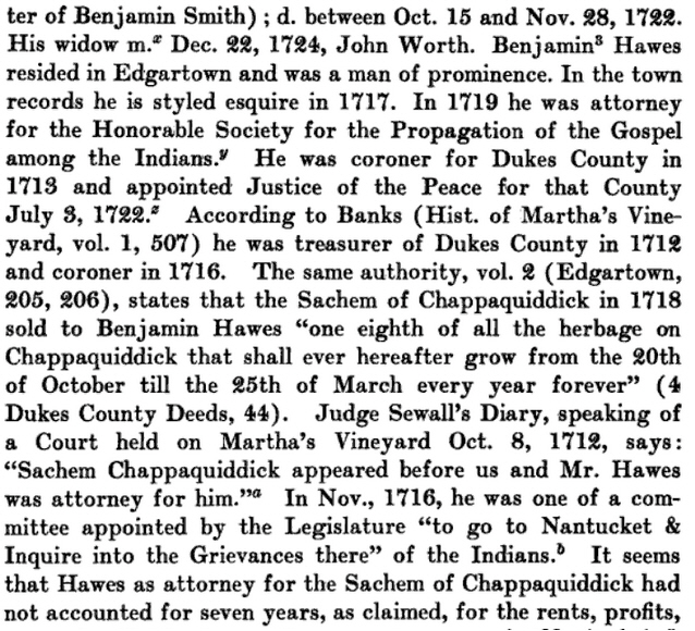 iii.Benjamin Hawes b. 25 Apr 1712 in Edgartown, Dukes, Mass