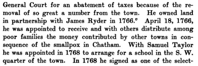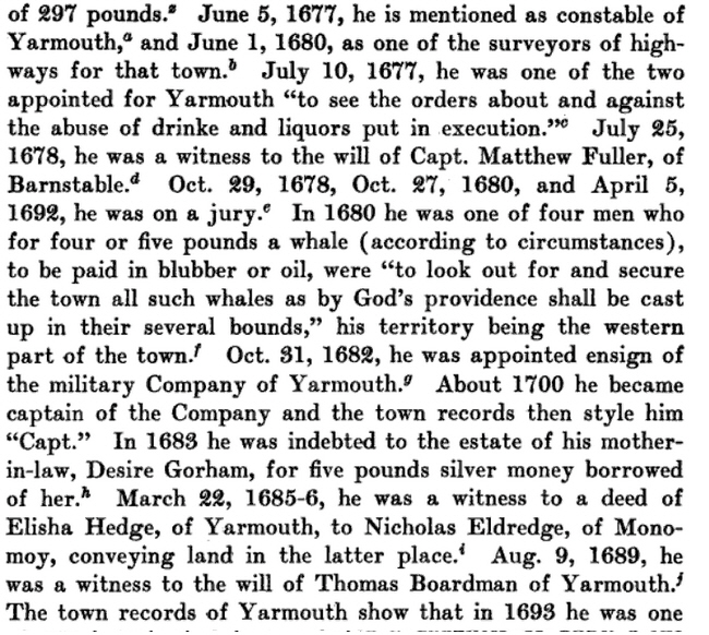 He was appointed ensign of Yarmouth’s military Company and by 1700 was Captain. The town records show that he was a member of a committee to choose a schoolmaster in 1693. He was a representative in the Legislature at Boston in 1698.