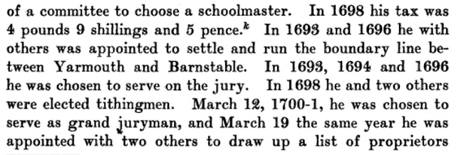 In 1676 his tax was 3 pounds, 10 shillings and 6 pence out of the total for the town total of 297 pounds.  In 1677 he was constable of Yarmouth and in 1680 he was one of the surveyors of highways for that town.  On 10 Jul 1677 he was one of the two appointed for Yarmouth “to see the orders about and against the abuse of drink and liquors put in execution.”