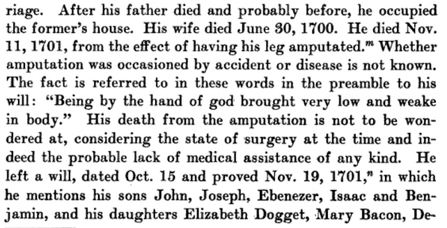 On 31 Oct 1682, John was appointed an Ensign of the Yarmouth military company. About 1700 he became captain of the company and was called that thereafter. John was the Barnstable town treasurer from 1695 to 1698. He was chosen a representative in the Legislature at Boston in 1697 and 1698. He died in Barnstable 11 Nov 1701, from the effect of having his leg amputated. The record does not indicate whether or not it was because of an accident or disease.