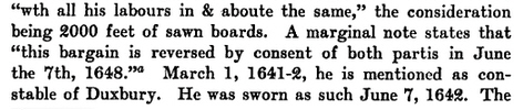 ESTATE: On 2 October 1637, “ten acres of upland are granted to Edmond Hawes, lying cross Greens Harbor Path”. On 10 September 1641, “Edmond Hawes of Duxborrow” sold to “Robert CARVER [our ancestor] of the same, sawyer, … all those his ten acres of upland lying cross Green’s Harbor path” (annotated “This bargain is reversed by consent of both parties in June the 7th 1648”)
