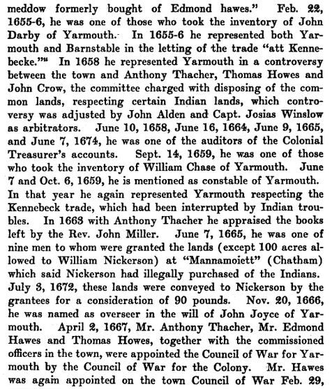 In 1665, to settle the difficulty at Monomoy, now Chatham between William Nickerson and the Colonial government respecting the illegal purchase of land of the Indian sachem there, Nickerson was allowed one hundred acres of the purchased land, and Major John FREEMAN, with Thomas Hinckley, William Sargeant, Anthony Thacher, Nathaniel Bacon, Edmund HAWES, Thomas HOWES, Sr, Thomas FOLLAND, Sr and Lt. Joseph Rogers was allowed a grantee of the remaining portion with the privilege with the above named to purchase adjacent land.