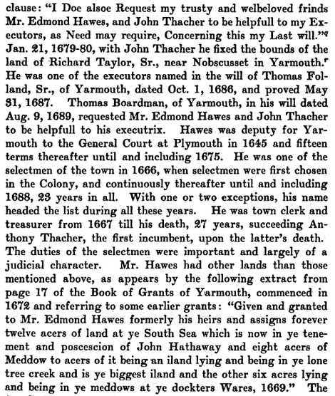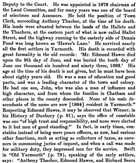 Edmund Hawes resided for some years at Duxbury before he came to Yarmouth. In 1645 he was an inhabitant of Yarmouth and a Deputy to the Court. He was appointed in 1672 chairman of the Land Committee, and for many years was one of the board of Selectmen and Assessors. He held the position of Town Clerk, succeeding to Anthony Thacher, at the time of his death. His lands were situated between the lands of the Hallets and the Thachers, at the eastern part of what is now called Hallet street, and the highway running to the easterly side of Dennis Pond was long known as “Hawes’s Lane.” [Today, all I can find in Yarmouth is Hawes Run Road near the mill pond.] He survived nearly all the first settlers in Yarmouth. His death is recorded with great formality in the old records :