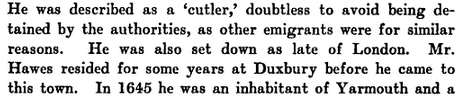 (on or about 5 April 1635, “Edmund Hawes, cutler, late of London,” was included in the passenger list of the James, about to sail from Southampton for New England [Drake’s Founders 56])