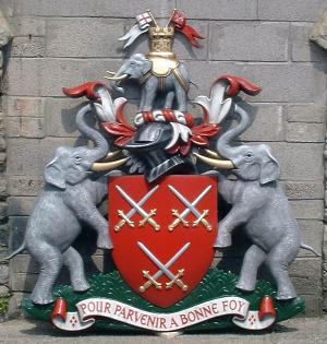 The Cutlers’ Company Arms have been in use since 1476. Its current Elephant and Castle crest was granted in 1622: this features two elephants and three crossed-swords, a helmet and a smaller elephant and castle. The elephant probably relates to the ivory used in hafting swords, knives and other weapons – an expensive material employed for the best of implements. The elephant and castle crest gave rise to a pub of the same name on the site of an old cutlers’ inn at Newington, south London which in turn gave its name to the well-known area Elephant and Castle.