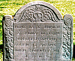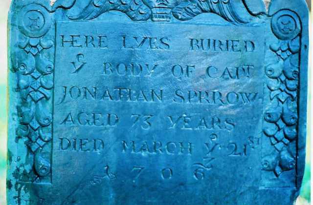 Jonathan Sparrow Gravestone –  HERE LYES BURIEDYe BODY OF CAPTJONATHAN SPRROWAGED 73 YEARS DIED MARCH Ye 21st 1706/7