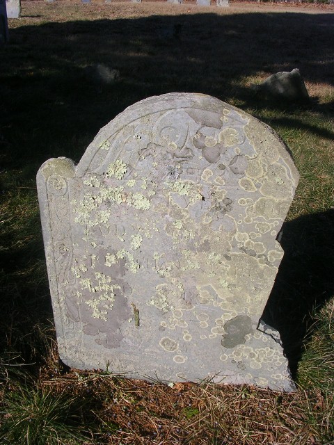 This gravestone along with that of Thomas Mulford is the oldest on the Outer Cape from Orleans to Provincetown. The side borders are deeply carved with fruits and gourds. It is carved in the style of William Mumford or Nathaniel Emmes.