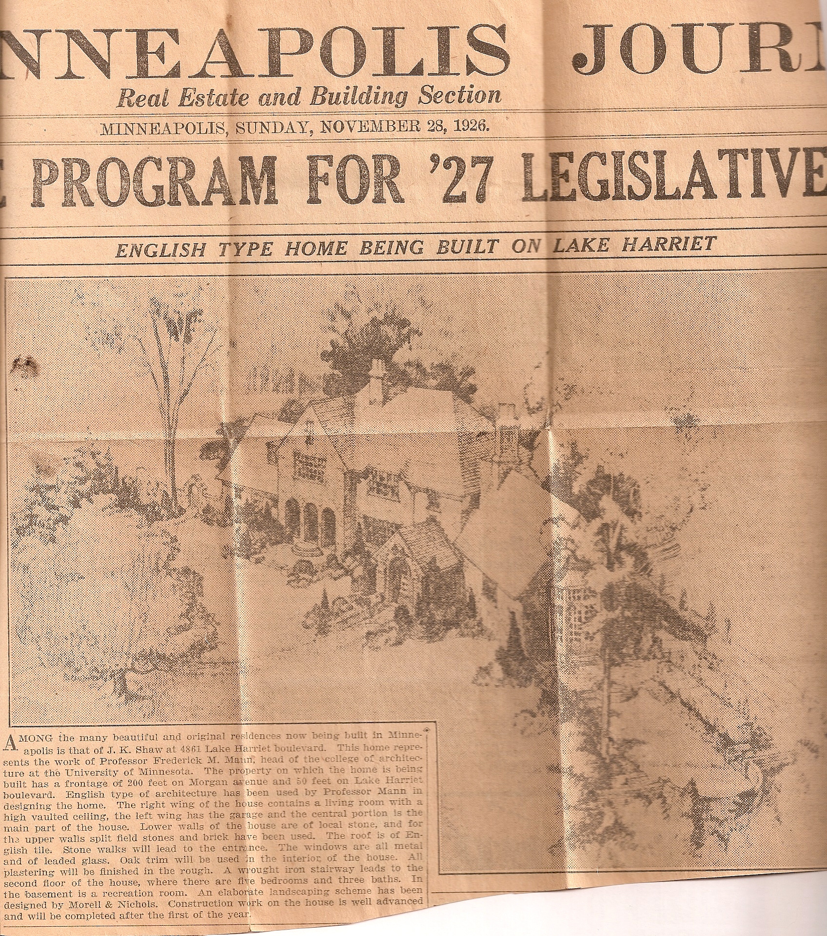 Among the many beautify and original residences now being built in Minneapolis is that of J. K. Shaw at 4861 Lake Harriet Boulevard. This home represents the work of Professor Frederick M Mann , head of the college of architecture at the University of Minnesota. The property on which the home is being built has a frontage of 200 feet on Morgan Avenue and 50 feet on Lake Harriet Blvd. English type of architecute has been used by Prof. Mann in designing the home.
