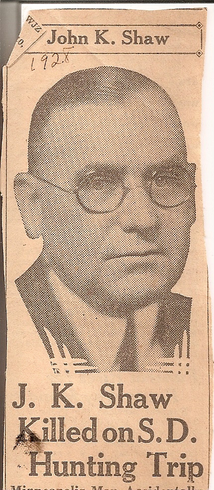 John K. Shaw was accidently shot and killed while hunting near Arlington, South Dakota on Friday 2 Nov 1928. Mr. Shaw was 55 years old. He mad been an officer of the Cleotex Company and associated concerns for many years. His home was at 4861 East Lake Harriet Blvd. Mr. Shaw left Minneapolis Tuesday with four companies: Dr. J . F. Beck, Mobile, Ala; V. B. Seck, Tulsa, OK; P. J. Sonner, Winfield, KS; and Tradwell Munroe of Chicago. The five made camp at Bryant, South Dakota to hunt at Badger Lake.