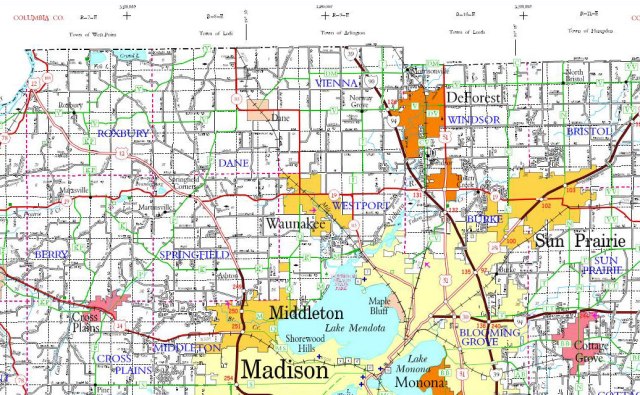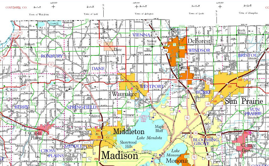 DANE, County, is bounded on the northwest by the Wisconsin river, by which it is separated from Sauk; on the north by Columbia, on the east by Dodge and Jefferson, south by Rock and Green, and west by Iowa. It was established ¿ for judicial purposes December 7, 1836, and fully organized March 11, 1839. The seat of justice is at Madison, near the geographical centre of the county, and the Court House is the best in the State. Dane county contains about 1,250 square miles, mostly of good tillable land, and a fertile soil, well apportioned between woodland, openings and prairie, and is well adapted to grazing, and the raising of grain, roots and fruit. There is, in the county, considerable non-resident land which can be bought on reasonable terms. One of the most attractive features of the county is its beautiful lakes of clear, pure cold water, originating in deep springs. The Catfish river forms the outlet of these lakes, and passes from the northwest to the southeast completely through the chain known as the Four Lakes. ¿ The county is watered by the Catfish and Sugar rivers, and Black Earth, Badfish, Token, Waterloo and Koskonong creeks. The population in 1836 was Ebenezer Brigham; 1838, 172; 1840, 314; 1842, 8,289; 1847, 10,935; 1850, 16,654. Farms, 1,511; manufactories, 87; dwellings, 3,510.”