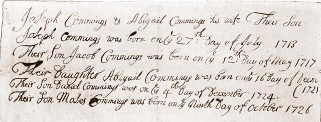 i. Joseph Cummings b. 27 Jul 1713 in Topsfield, Essex, Mass;; m. 23 Sep 1739 in Ipswich to widow Martha Hodgkins (b. 1713 – ) Joseph and Martha had four children born between 1740 and 1749.