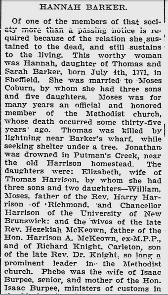 Hannah Barker Obit — From the History of Methodism in Sunbury County St. John Daily Sun – Sep 23, 1905