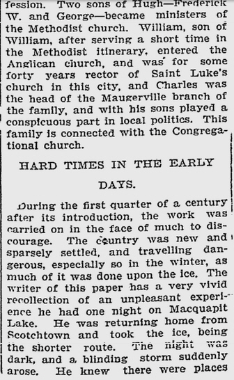 According to local legend, while crossing the frozen St. John River to tend his father Samuel’s cattle on Hartt’s Island, Samuel Jr. fell through and nearly drowned. He apparently cried to the Lord to save his life, vowing to devote his life to God if he survived. He seems to have found a piece of rope frozen to the edge of the ice with which he was able to pull himself to safety. He kept his vow and became a well known clergyman and evangelist. He reputedly had a great gift for singing gospel songs and by this influence converted large numbers of people. He was one of the leaders of the Free Baptist movement in its early years and had great influence on parishioners in both New Brunswick and Nova Scotia.