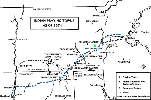 Old Connecticut Path Trailhead just Northeast of Boston at Watertown, Danforth Plantation is marked in Green
