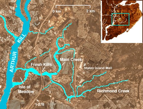 Fresh Kills (from the Middle Dutch word kille, meaning “riverbed” or “water channel”) is a stream and freshwater estuary in the western portion of the of Staten Island. It is the site of the Fresh Kills Landfill, formerly New York City’s principal landfill.