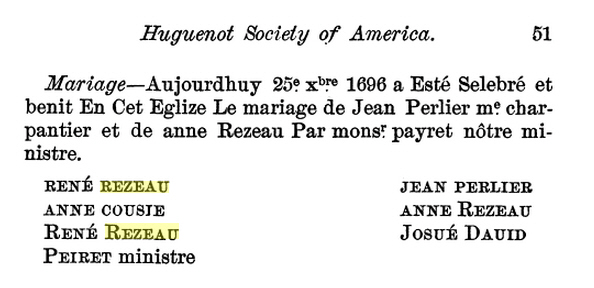 Jean Perlier II was born 3 Nov 1669 in La Treamblade, Charante, France. He was a Huguenot and immgrated with his parents Jean PERLIER I and Marie ARNAUD and brother Andre. He married Anne REZAEU on 25 Oct 1696 in New York at l’Eglise Francoise a la Nouvelle York, by the minister Monsieur Payret (Peiret).