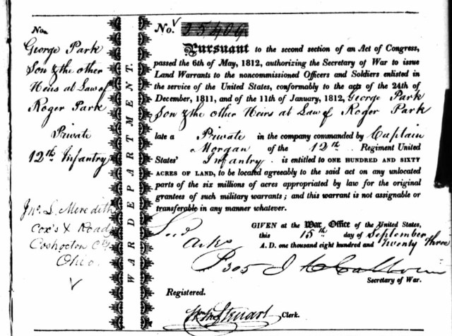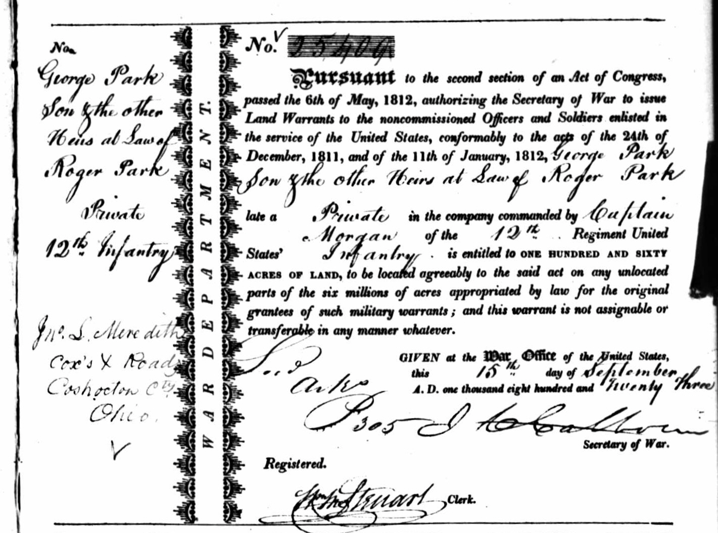 15 Sep 1823 – Roger’s son George received a grant of 160 acres in Coshocton County, Ohio for Roger’s service in the War of 1812. The grant was signed by the famous John Calhoun, then Secretary of War.
