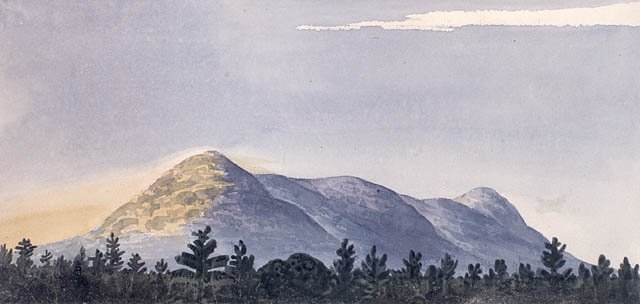 “Mars Hill”, 1832, watercolour by Joseph Bouchette. Mars Hill was a pivotal reference point in the boundary dispute between New Brunswick and Maine in the 1820s. Forty miles from the source of the St. Croix River (not far from Woodstock), the British argued that it marked the “highlands” referred to in the Treaty of Ghent, at which the border line drawn due north from the source of the St. Croix should terminate. Credit: Library and Archives Canada/C-047011.