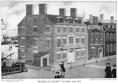 Typical of taverns of the time, The Bunch-of-Grapes served multiple functions in the life of the town. One could buy drinks, concert tickets, slaves; meet friends, business associates, political co-conspirators. Located in the center of town activity, the facade of the Bunch-of-Grapes building featured iconic signage: “Three gilded clusters of grapes dangled temptingly over the door before the eye of the passer-by.”