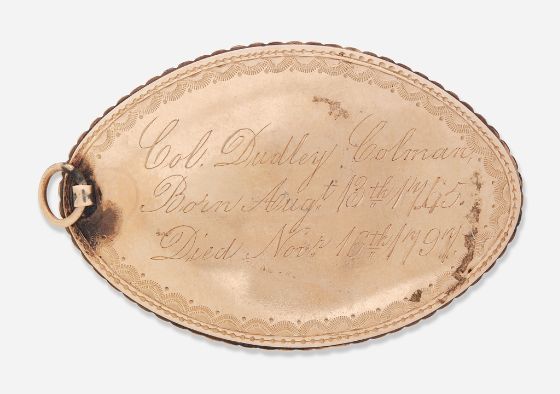 America, late 18th century, unsigned, subject identified in engraved inscriptions on the reverse, watercolor on ivory, 1 1/2 x 1 in., in a navette-shaped gilt-brass case with beaded surround, the reverse with bright-cut border and inscribed “Col. Dudley Colman, Born Aug.t 13th 1745, Died Nov 16th 1791. [actually reads 1797]” Condition: Missing glass. Note: Colonel Dudley Coleman was born August 13, 1745, in Newbury, Massachusetts, the son of Benjamin and Anne Coleman. He is briefly mentioned as a lieutenant in Massachusetts Soldiers and Sailors of the Revolutionary War, Boston, 1902, p. 49. $300-500