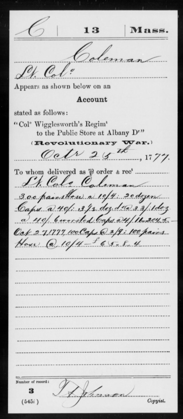 Additional military information:  Lieutenant in Captain Stephen Kent’s Company, 1775, for defense of the coast at Newbury; Adjutant; general order dated 8 Oct 1776, appointing said Coleman to serve as Brigade Major in Gen. John Nixon’s brigade during the time that Maj. Row was employed on the fortifications; Gen. Nixon’s brigade consisted of the 3rd5th6th and 7th Massachusetts Regiments.