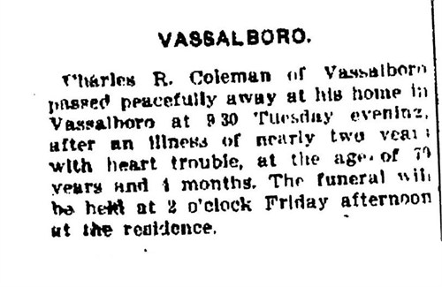 iii. George Weston Coleman b. 23 Oct 1876 in Vassalboro, Maine; d.  20 Mar 1923 in Vassalboro, Maine