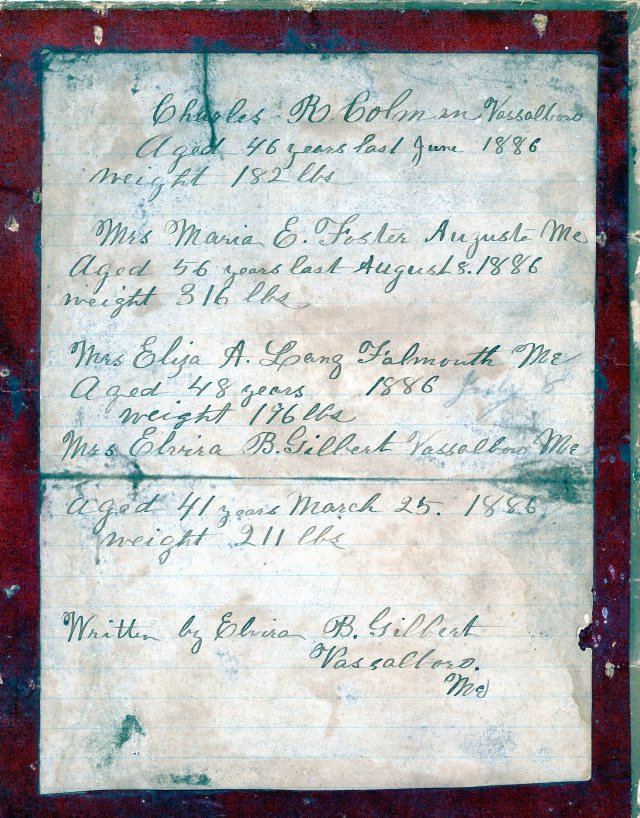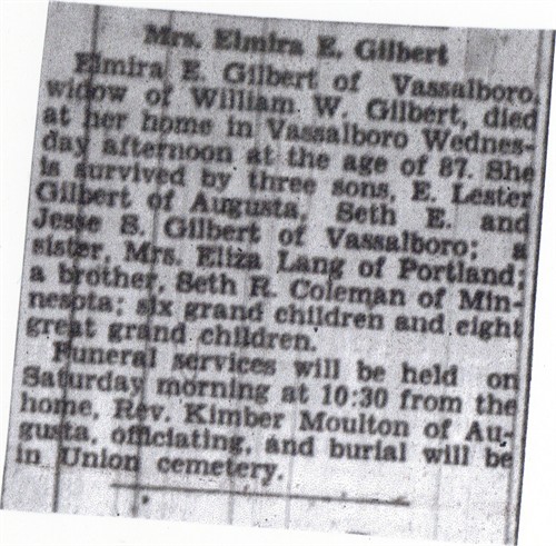 Elvira’s husband  William Wallace Gilbert was born 3 Jun 1839 in Leeds, Kennebec, Maine.   His parents were Edward Jones Gilbert (1815 – 1899) and Deborah Turner (1818 –  1897).  He first married 10 Aug 1862 to Mahala B. Bumpus (1841 in Leeds, Androscoggin, Maine – 18 May 1863 in Belgrade, Kennebec, Maine) who died in childbirth.  William died 21 Apr 1916 in Vassalboro, Maine.