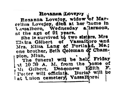 4. Roxanna “Roxie” Parmenter Coleman 24 Feb 1835 Vassalboro Augustus Plummer