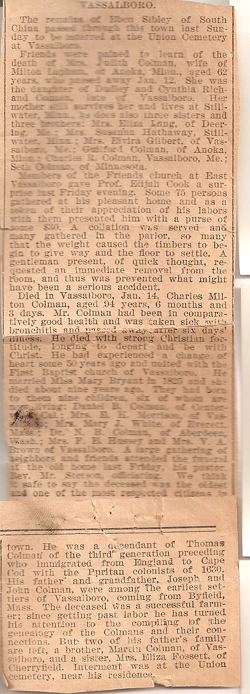 Dudley Coleman was born 17 Nov 1805 in  Vassalboro Maine. His parents were Joseph COLEMAN and  Mary CROSS. Dudley married Cynthia Maria RICHARSON 29 Oct 1829 in China, Kennebec, Maine.  Dudley was a New England farmer, of about 160 acres near Vassalboro, Maine.  Dudley died 25 Sep 1865 in Vassalboro, Maine.