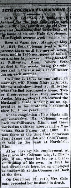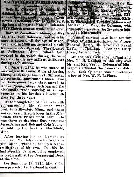 After completing his apprenticeship, Seth moved to Stillwater, Minnesota, where he opened his own blacksmith shop.  However, in 1891, Seth moved his family to northern Wisconsin, after securing a job as a blacksmith for the Ohio Coal Co., in Ashland. He remained with the company until it closed in 1894. Seth, his wife Emma, and his youngest son, Vernon, returned to Champlin.