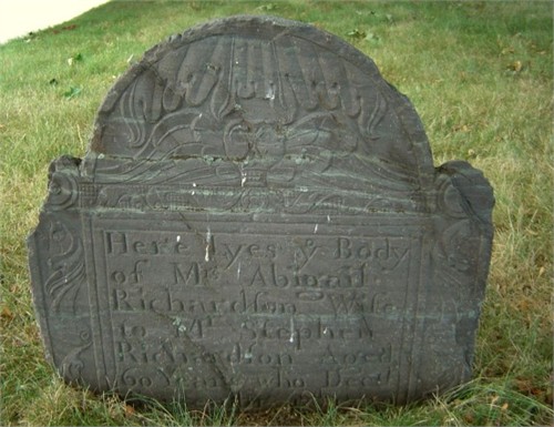 Abigail Wyman Richardson – Headstone – Woburn, MA First Burial Ground: “Here lyes ye body of Mrs. Abigail Richardson, wife of Mr. Stephen Richardson, aged 60 years, who died September 17th, 1720.”