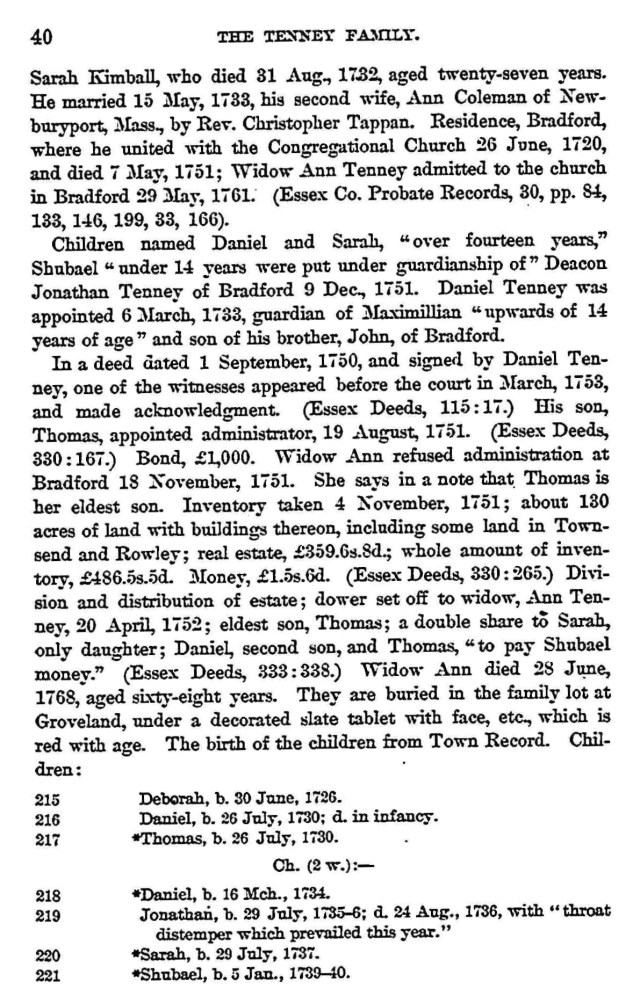 Anna’s husband Daniel Tenney was born 14 Feb 1702 in Bradford, Essex, Mass. His parents were Deacon Samuel Tenney (1667 – 1747) and Sarah Boynton (1672 – 1709). He first married about 1725 to Sarah Kimball (b. abt 1705 – d. 31 Aug 1732) and had three children. Daniel died 7 May 1751 in Bradford, Essex, Mass.