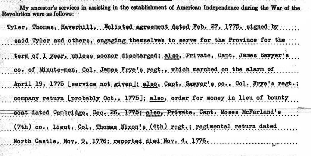 Thomas was a private in Col. Mulliken’s regiment in expedition to Nova Scotia in 1755. Thomas was first lieutenant of Capt. Nathan Gage’s company of Bradford, Massachusetts which marched on the alarm Apr 19 1775 to Cambridge and participated in the Battle of Bunker Hill.