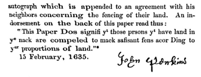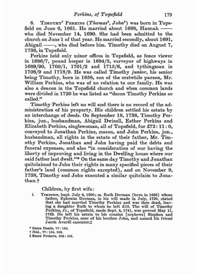 “Given and granted [in 1634] unto John Perkins the elder 40 acres of land, more or less, bounded on the east by Mr. Robert Coles his land, on the south by a small creek, on the west unto yet town side.  1635.  1635 Granted Jno. Perkins Sr. 3 acres of upland and 10 of meadow lying toward the head of Chebacco creek, also a little island called More’s point about 50 acres on the south side of ye town river.  In 1636 Also 10 acres on part whereof he hath built an house, having Wm Perkins on S.W. – Also  in 1639 6 acres of meadow and 6 upland joining to the former 10 acres, all 3 lying at east end of town having Wm White’s land on N.E. and a highway to Jeffries neck on N.W.  1636.  John Perkins Sr. was granted 40 acs of meadow and upland at Chebacco, which he sold to Tomas Howlet 1636.  1639.  Granted to John Perkins 6 acres planting ground on South side river.”. On 10 December 1644, “John Perkins of Ipswich in America” and Thomas Perkins exchanged land in Ipswich.
